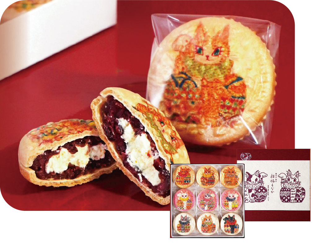 商品化されたのは、無病息災や魔除け、開運招福、良縁、商売繁盛などを願って、招き猫が描かれた「招福もなか」。